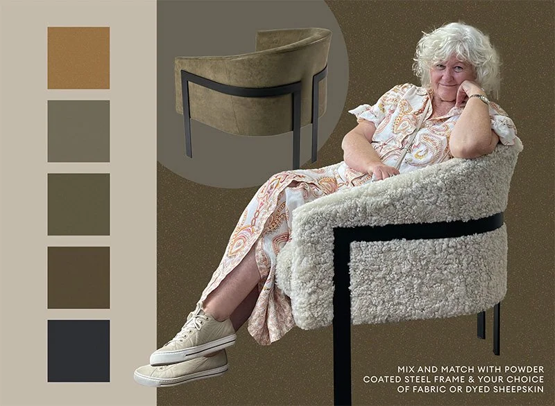 Bowie is a modern contemporary design, bringing in the raw architectural steel base it creates a depth and gives it a modern twist. The steel frame can be customised in various powder coated steel colours – featured here is Fresh Kinetic Gold, Aged Brass Kinetic, Vintage Copper KInetic, Prosecco Pearl and Flaxpod. Pair your frame with desired sheepskin colour or fabric of choice and you have yourself an absolutely stunning chair that looks like a piece of art from every angle.